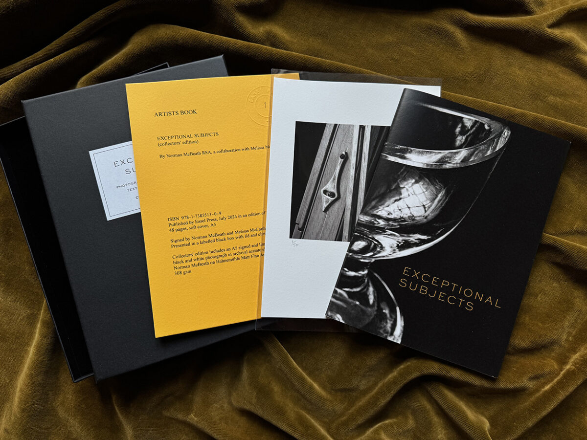 The artists' book version (shown in the photograph) is published in an A5 size limited edition of 350. This is a forty-eight-page book with twenty-six black and white photographs and a response to the photographs, Delta, Ditto, Darkness, by the writer Melissa McCarthy. Exceptional Subjects has been acquired by permanent collections which include the British Library; Royal Scottish Academy; University of St Andrews Special Collections; University of Edinburgh Special Collections,; The Ballinglen Arts Foundation and The Centre for Print Research, UWE, Bristol.